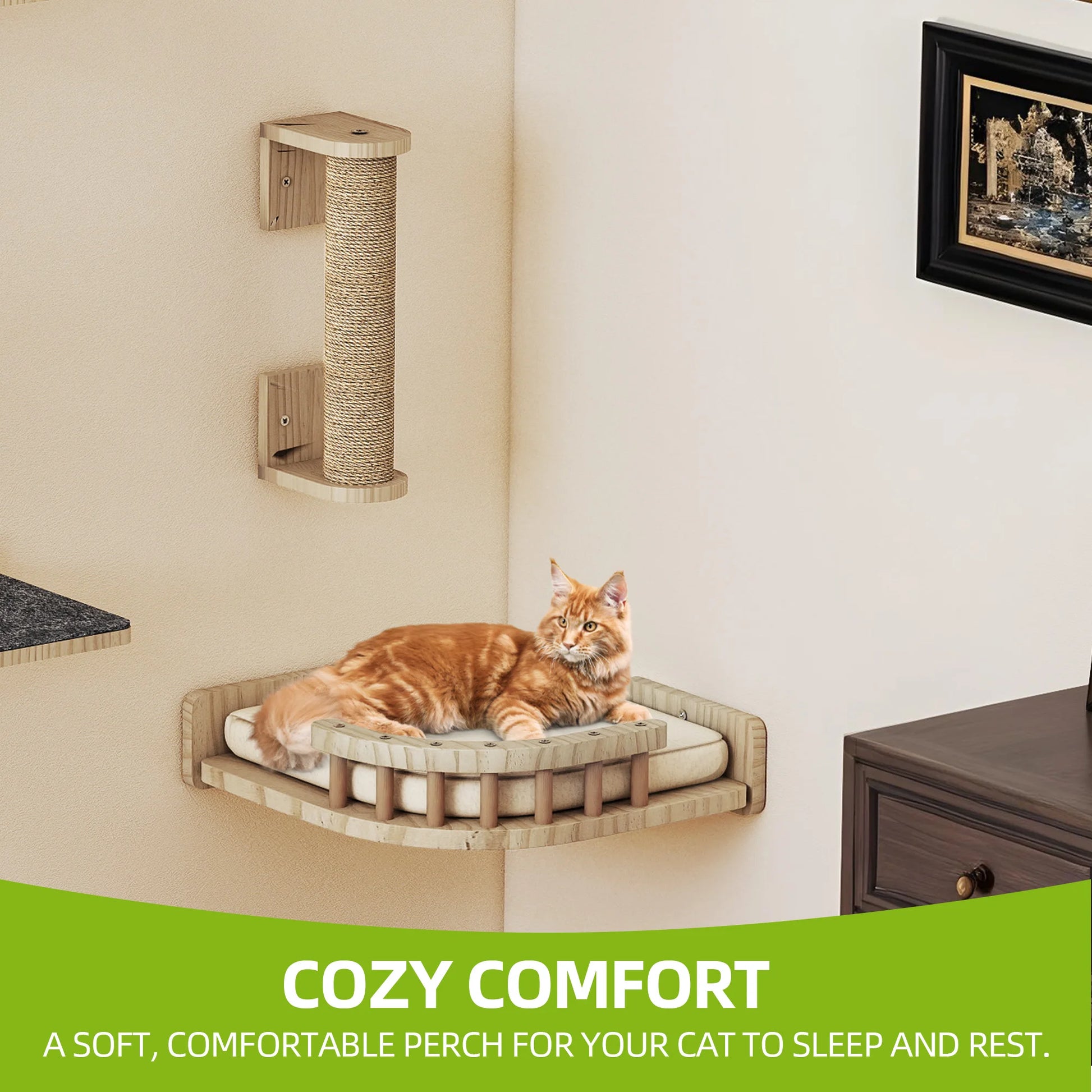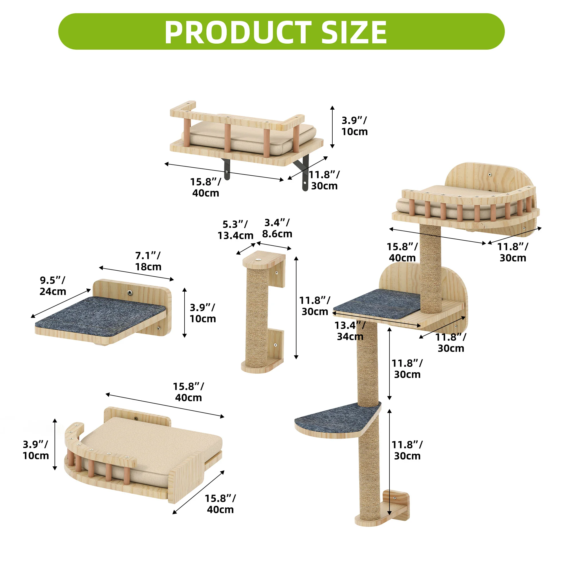 A versatile 7-piece set crafted from wood, designed to turn walls into an engaging space for cats. It includes essential elements like scratching posts, a corner platform, stair climbers, and a cat bed, catering to feline needs for climbing, playing, scratching, and resting.